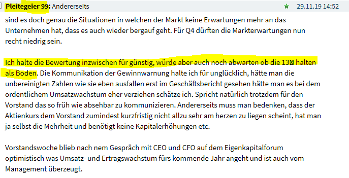 Ich halte die Bewertung inzwischen für günstig, würde aber auch noch abwarten ob die 13 halten als Boden. Die Kommunikation der Gewinnwarnung halte ich für unglücklich, hätte man die unbereinigten Zahlen wie sie eben ausfallen erst im Geschäftsbericht gesehen hätte man es bei dem ordentlichem Umsatzwachstum eher verziehen schätze ich. Spricht natürlich trotzdem für den Vorstand das so früh wie absehbar zu kommunizieren. Andererseits muss man bedenken, dass der Aktienkurs dem Vorstand zumindest kurzfristig nicht allzu sehr am herzen zu liegen scheint, hat man ja selbst die Mehrheit und benötigt keine Kapitalerhöhungen etc.