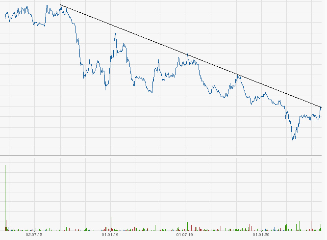 Die Aktie ist heute bei 12 grade am langfristigen Abwärtstrend wollte ich mal anmerken, habe einen Chart angehängt. Wäre doch ein gutes Zeichen wenn man die überspringen könnte. Phantasie sollte ja da sein wenn immer mehr Geschäftsprozesse auch durch Corona digitalisiert werden müssen?