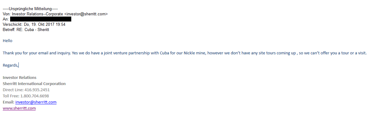 Also richtig cool ist ja, dass es Sheritt gelungen ist ein Joint Venture in Kuba zu bekommen :-)