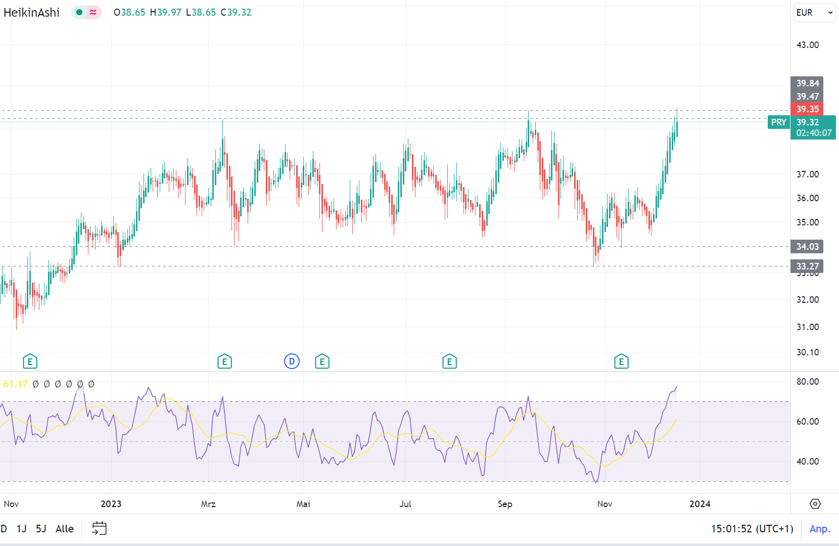 Prysmian Kommt jetzt der finale Dipp? Sieht heute so aus, als würde Kurs endlich das ATH und damit den Widerstand­ auflösen wollen.
