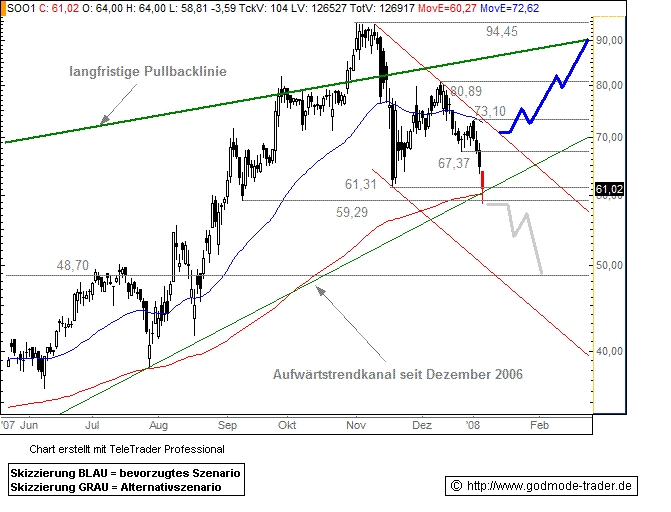 Rückblick: SOLON befindet sich mittel- als auch langfristig in einem intakten Aufwärtstrend. In diesem erreichte die Aktie bei 94,45 Euro ein Allzeithoch, bevor die Aktie zu einer ausgedehnten Korrektur ansetzte. Diese führte die Aktie heute mit einem bisherigen Intradaytief bei 58,81 Euro an ein massives Unterstützungscluster aus lokalen Tiefs, dem exp. GDL 200 und der Aufwärtstrendlinie seit Dezember 2006 heran.