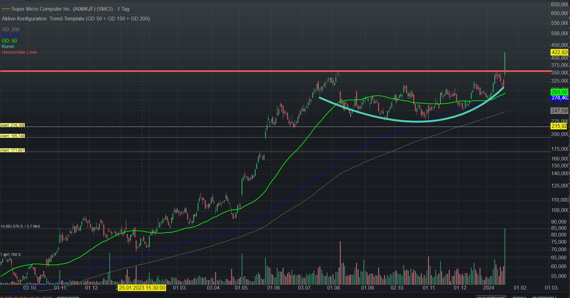 ...einzuwenden. Zumal 18% immer noch eine hohe Gewichtung ist. Man muss sich allerdings auch vor Augen halten: die US Märkte sind gestern erst auf neue ATHs ausgebrochen und das obwohl die Fantasie von fallenden Zinsen zuletzt einen kleinen Dämpfer erhalten hat. Eine SMCI ist gestern unter sehr starkem Volumen auf ein neues ATH ausgebrochen und hat auf Tageshoch geschlossen - nachbörslich ging es sogar noch ein kleines Stück weiter. Natürlich kann es nach solch einem run nächste Woche einen temporären, gesunden Rücksetzer geben. Vermutlich sehen wir nun eine kurze Konsolidierung auf hohem Niveau. Aber insgesamt glaube ich das es das noch nicht war bei SMCI. Ich sehe gute Chancen das wir dieses Jahr in Richtung 600$ laufen und auch die Aussichten für das kommende Jahr sind gut. Ich bleibe hier mit einer hohen Gewichtung an Board!