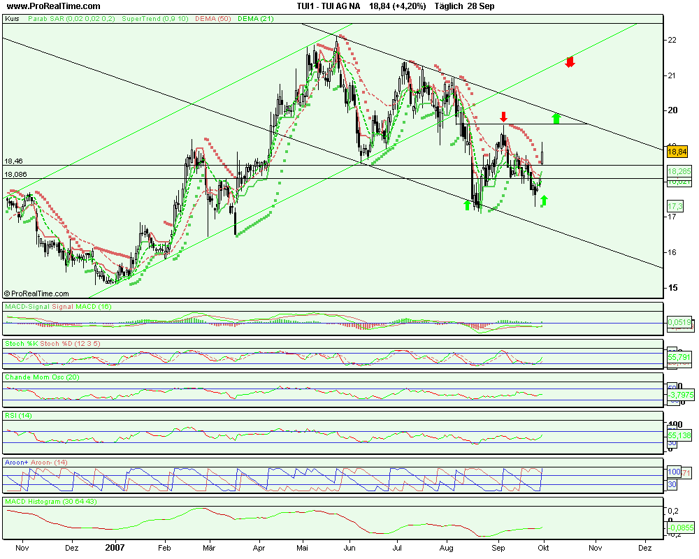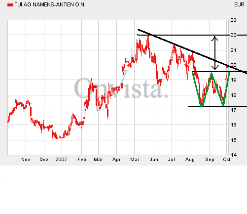 Eine Tatsache ist, dass der Kurs sich nicht über 20 Euro gehalten hat. D.h. der mittelfristige Abwärtstrend ist nach wie vor intakt. Ich denke, dass der Kurs der Tui-Aktie der fundamentalen Situation entsprechend erst mal wieder etwas nach unten läuft, auch weil er wieder mal nur durch 'Gerüchte' und verschrobenen Hoffnungen um eine Frenzel-Ablösung nach oben gepusht wurde. Die Aktie bewegt sich im Übrigen zur Zeit analog zum Gesamtmarkt. Die meisten Papiere bewegen sich unter ihren Tops.