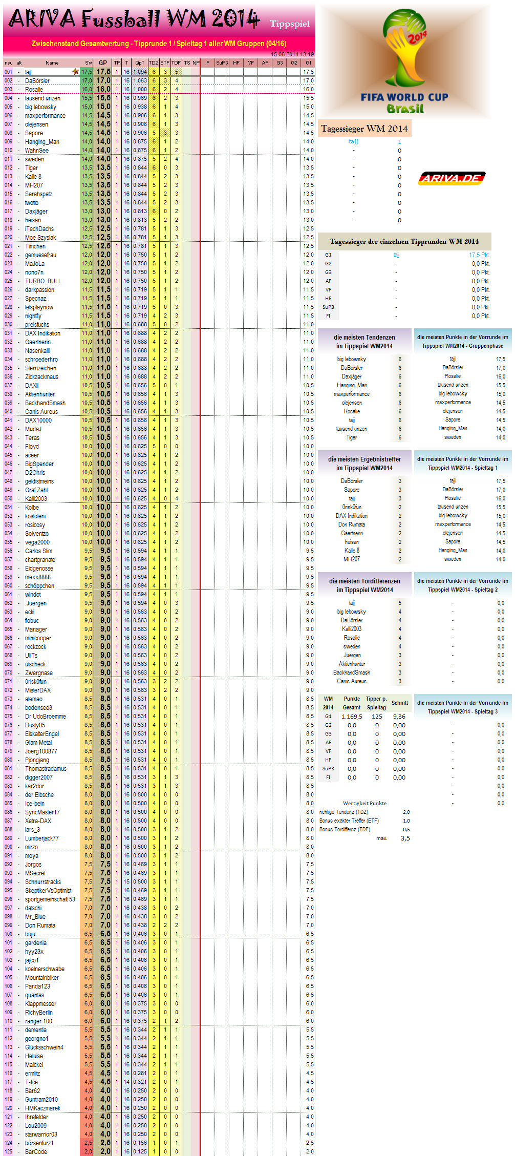aber da macht ne WM und nur 78 Spiele / 8 Tipprunden nich soviel aus wie der saisonale Ligenbetrieb der anderen 7 Tippspiele.. wo´s teils 4x soviele Spiele sind.. ;-)