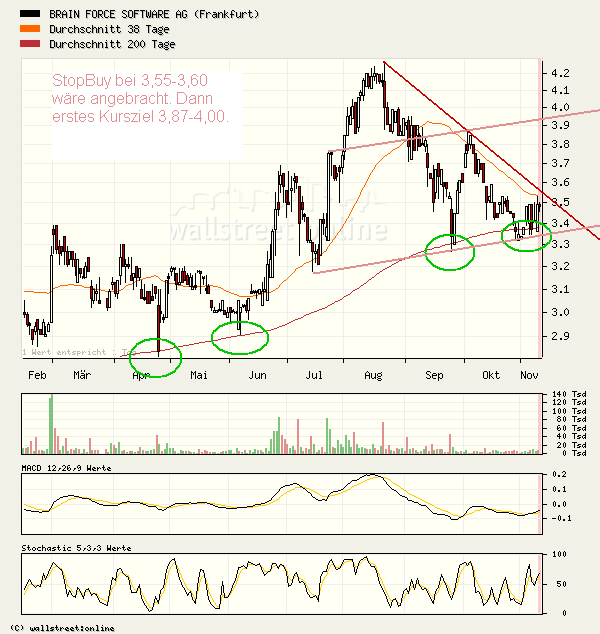 hier wird auch bald entschieden wo´s lang geht. Nach oben ist das Ziel 3,78 - 3,80 € was gebrochen werden muss. Nach unten sollten wir in Bereich 3,30 € halt finden, falls dies eintrifft, werde ich nachkaufen...