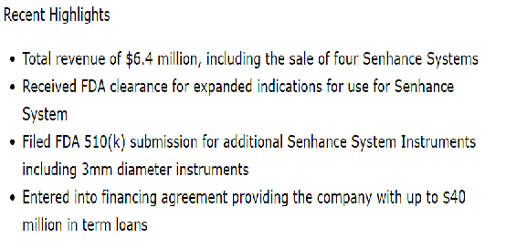 "We need 3-4 more sales in the US to compile favorable clinical data then this will explode. If they can, which I fell fairly confident they will, clinically prove that Senhance surgery is equivalent to or superior to DaVinci surgery at lower costs then BAM, get ready for a lucrative ride. I have been long on this company for a many years. Follow the plan: Early adopters, clinical data then the growth curve will pull the company."