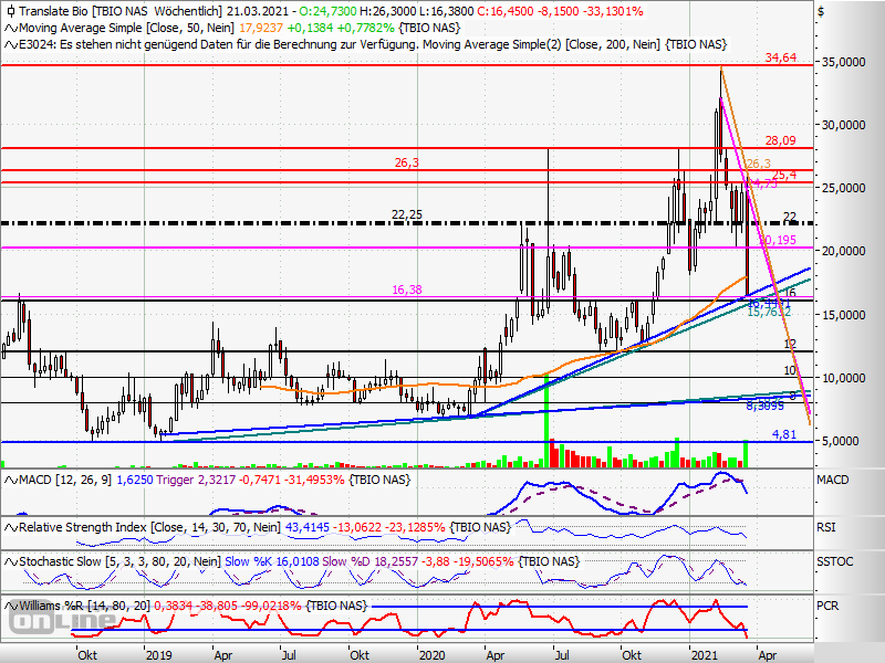 Es könnte sein, daß bereits der Support bei 16 hält, das MACD-Signal deutet jedoch mehr daraufhin, daß noch tiefere Kurse kurzfristig eintreten dürften und der Uptrend seit März 2020 keinen Bestand haben dürfte. Betonboden wäre dann die Gegend um 12. Der flache Uptrend seit Anfang 2019 dürfte aber safe sein.