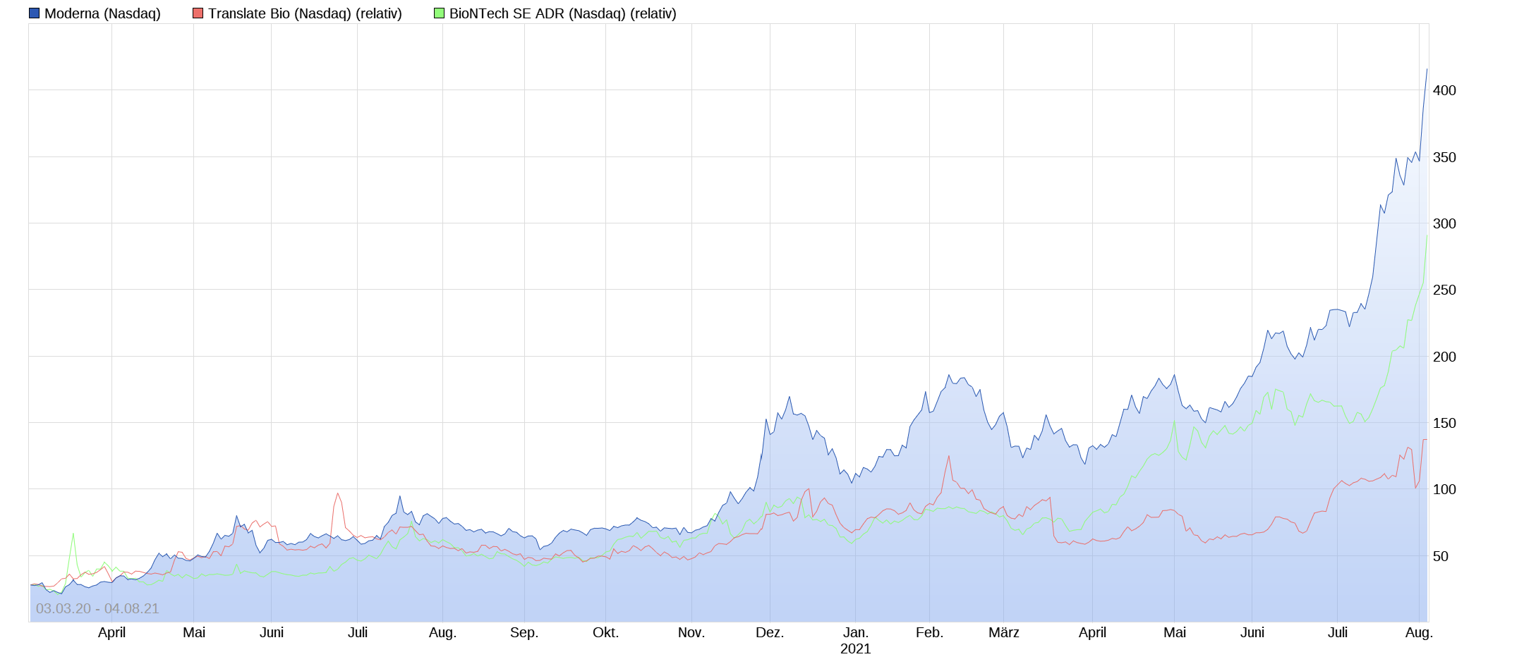 "... Zwar stieg die Translate-Aktie in den vergangenen Wochen bereits um rund +60%, doch liegt die Marktkapitalisierung des Unternehmens mit kaum über 2 Milliarden US$ noch unverständlicherweise meilenweit von Modernas 130 Milliarden oder BioNTechs 68 Milliarden entfernt. Selbst CureVac kann nach seinem Fehlschlag noch über 10 Milliarden US$ Bewertung aufweisen. ..."