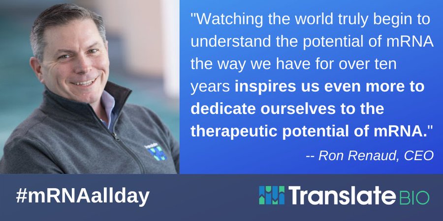 At Translate Bio, we believe that this is the beginning of a new era of mRNA vaccines and therapeutics, one where the promise of mRNA becomes reality. We look forward to 2021 and sharing more about our vision for the future and what the promise of mRNA means for Translate Bio.