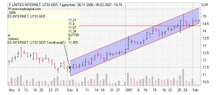 Rückblick: Die UNITED INTERNET Aktie erreichte am 12.05.2006 ein Allzeithoch bei 14,73 Euro Nach einer Korrektur bis 8,61 Euro durchbrach die Aktie am 09.10.2006 endgültig eine wichtige BUY Triggerlinie im Bereich um 11,65 Euro und zog danach erwartungsgemäß an. Am 26.01.2007 erreichte die Aktie das Hoch aus 2006. Seitdem pendelt die Aktie um dieses Hoch, wobei sie heute einen kurzfristigen Abwärtstrend überspringt. Dabei reißt sie ein kleines Aufwärtsgap zwischen 14,94 und 15,06 Euro. Der kurzfristige Abwärtstrend liegt heute bei 14,93 Euro.