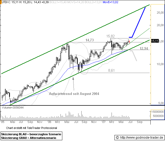 Rückblick: Die UNITED INTERNET Aktie (Nachrichten/Aktienkurs) befindet sich in einer mittelfristigen Aufwärtsbewegung. Im Februar 2007 markierte sie ein neues Allzeithoch bei 15,82 Euro und startete eine Zwischenkorrektur, welche oberhalb der 12,94 Euro Marke verlief. Seit Mai steigt die Aktie nun wieder an und nähert sich dem Allzeithoch bei 15,82 Euro. Das Chartbild ist auf sämtlichen Zeitebenen bullisch zu werten, die Korrektur der letzten Monate auf hohem Niveau kündigt eine weitere Aufwärtswelle an.