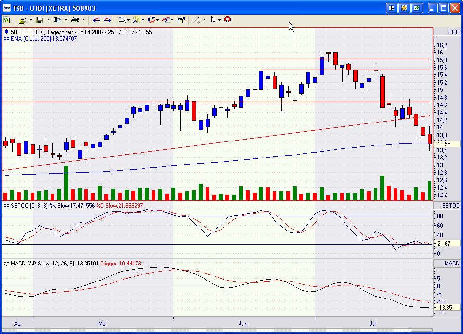 Die United Internet Aktie befand sich in einem mittelfristigen Seitwärtstrendkanal. Am 09.10.2006 hat die Aktie den Bereich dieser Seitwärtsbewegung signifikant nach oben verlassen. Dadurch hat sich das Chartbild eindeutig verbessert, denn die United Internet Aktie scheint am Beginn eines Trendwechsel zu stehen. Mit dem signifikanten Durchbruch aus dem Seitwärtstrendkanal wurde ein Kaufsignal ausgelöst. Die Aktien-Positionen können nun unter Beachtung der Indikatorenanalyse aufgebaut werden. Erst mit einem Wiedereintritt in den Bereich des Seitwärtstrendkanals (bei Kursen unter 11,20 €) sollten Zukäufe zurückgestellt werden.