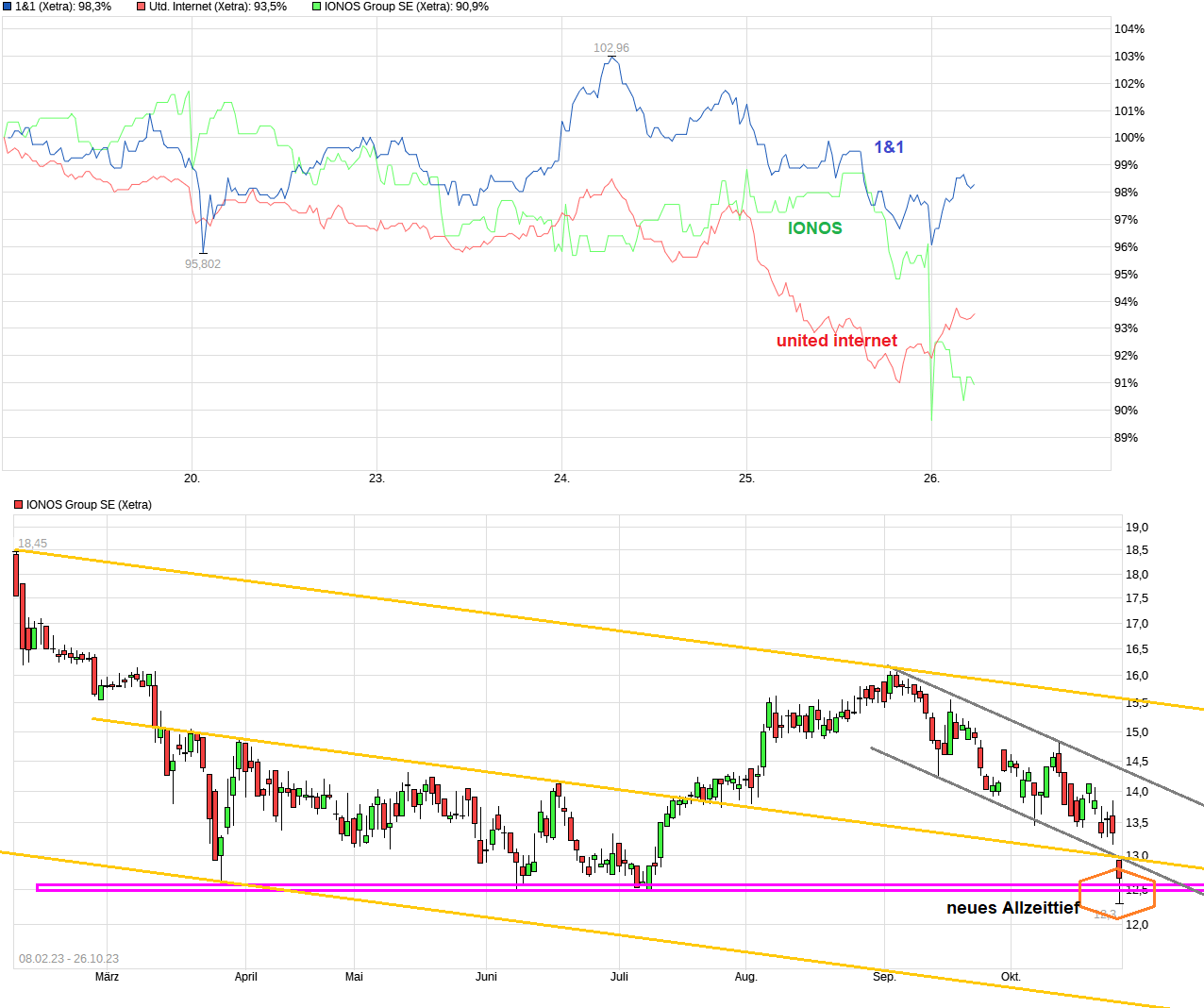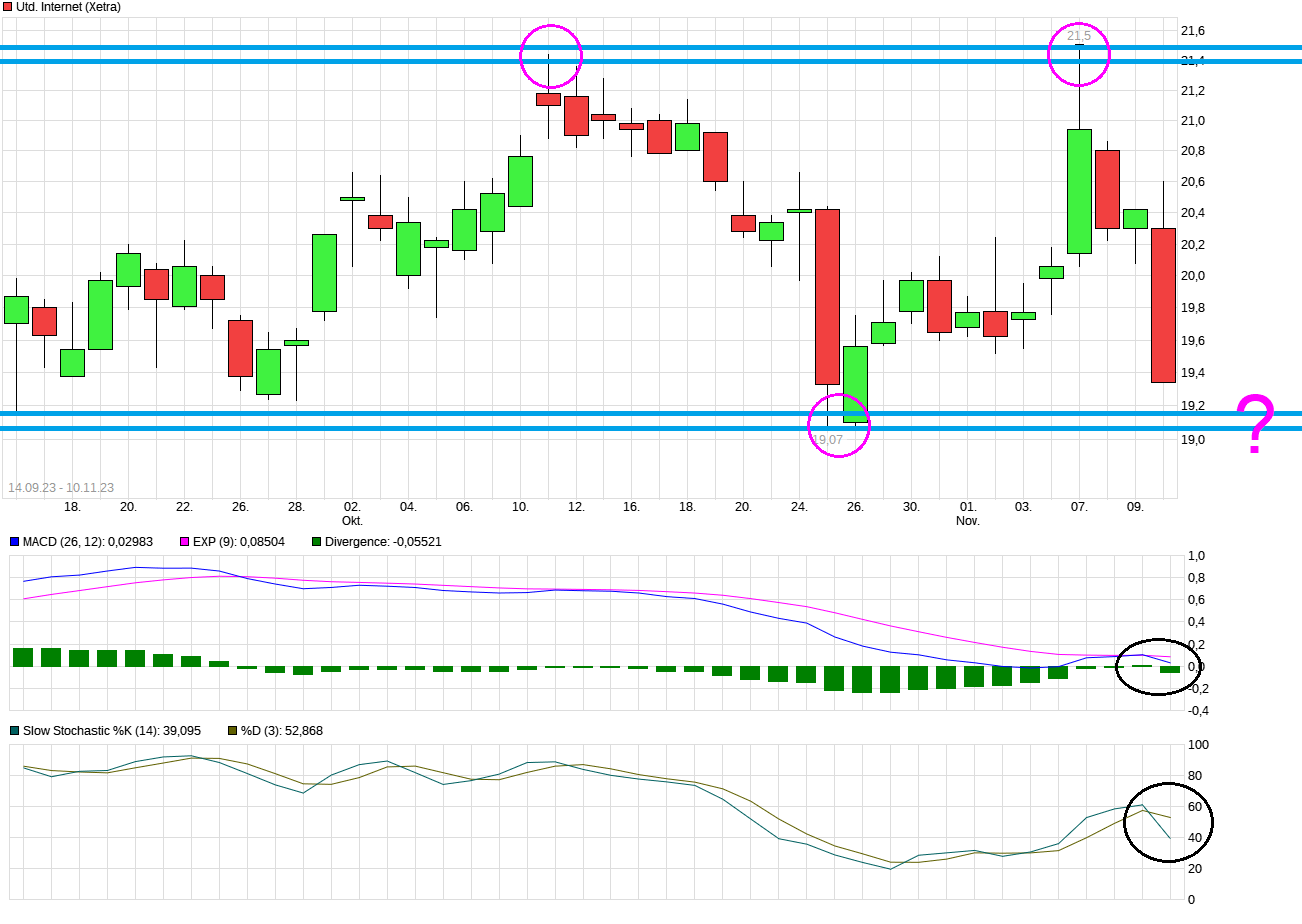 Tja, wer darauf eine 100% sichere Antwört geben könnte wäre man schnell reich? ;) Heute geht ja auch geht der Gesamtmarkt klar runter was auch belastet. Aber wenn parallel die beiden Grundsäulen Ionos und 1&1 auch verlieren, dann zieht es die Mutter eben auch runter. Von daher müßte man auch wissen was die beiden Werte weiter machen. Aus technischer Sicht ist erstmal interessant zu schauen, ob man sie Seitwärtsrange der jüngsten Zeit nach unten verlassen wird oder nicht, d.h. klar unter die 19,07 läuft. Das könnte sonst auch wieder technisch induzierte Anschlußverkäufe bringen.