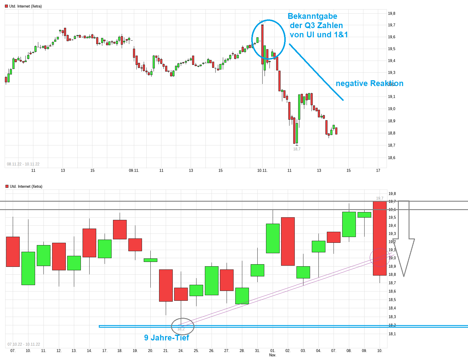 Und parallel stürzt leider die Dauerproblem-Tochter 1&1 Drillisch, an der UI mit fast 80% beteiligt ist, immer tiefer ab und belastet so natürlich auch zusätzlich klar den UI Kurs, da jeweils 1€ Verlust beim 1&1 Kurs ca. 130 Mio Wertverlust für Mutter UI bedeutet und UI die letzte Zeit schon wieder mehrere Euro gefallen ist. Was soll die hohen Belastungen der Seuchen-Tochter ausgleichen? Die Cloud-Sparte?!?! Da muß die schon brutal gute Zahlen und Prognosen bringen, wenn man eine fallende Dauerbleikugel wie 1&1 Drillisch klar überkompensieren will. Ein zunehmendes Problem: Ein IPO der Cloud-Sparte Ionos wird von Dommermuth sicherlich nicht in einem schwachen Börsenumfeld durchgezogen, wo der Markt wenig vorteilhafte IPO Kurse verspricht. Von daher kann es zwar sein, daß UI nach Ostern technisch schon bereit wäre für den Ionos-IPO, aber letztendlich die äußeren Bedingungen bestimmen wann die Sache über die Bühne gehen wird. Von daher rechnet der Markt vielleicht gegenwärtig jetzt doch nicht mehr mit einem so fix kommenden IPO, falls sich diese jüngste schlechte Börsenstimmung auch die nächsten Monate so weiter noch zeigen sollte. Solange die Unklarheit über den Ionos-IPO Zeitpunkt eher groß bleibt und parallel 1&1 noch nicht eine Bodenbildung erkennen läßt oder UI selber ein großes neues Kaufsignal im Chart erkennen läßt, bin ich hier weiter an der Seitenlinie und beobachte die Lage. Unschön würde es wohl, wenn man sogar noch unter 29,35 fallen würde in der laufenden Korrektur. Dafür müßte aber der Gesamtmarkt wohl nochmal klarer unter die Räder kommen und / oder UI selber etwas unerwartet negatives vermelden. Also mal abwarten wie sich zum einen jetzt die angespannten geopolitischen Dinge die nächste Zeit entwickeln, welche weiteren Zeichen FED&Co unter diesem Eindruck geben und was Dommermuth bei UI und 1&1 an Zahlenwerk bald präsentiert ( inkl. Aussagen zum kommenden IPO).