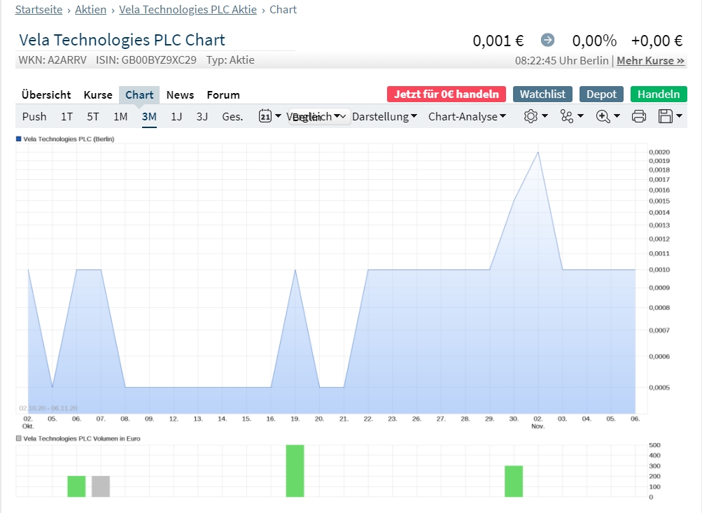 ...der 3 Monats-Chart von ARIVA. 4 Umsätze von insgesammt ca. 1.200,- €. Das ist schon sehr beeindruckend. Der Kurs ist so niedrig, dass es kaum noch niedriger angezeigt werden kann. Die Range endet einfach bei 0,0005 €