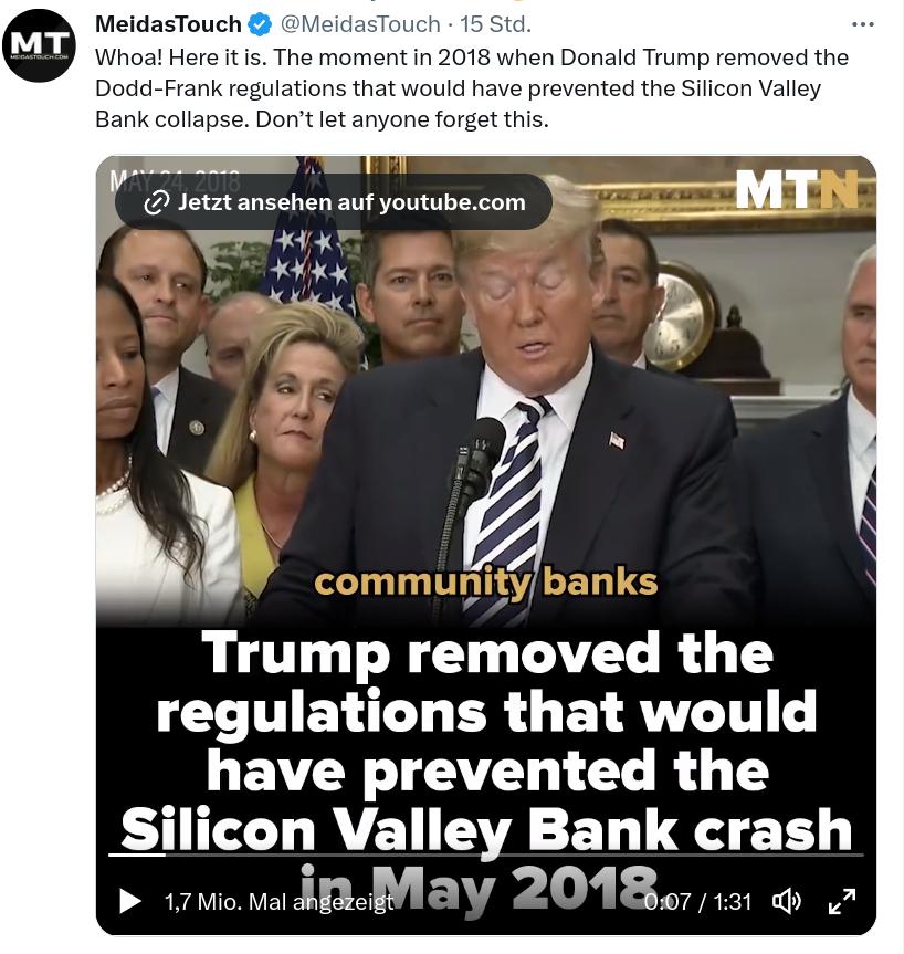 Und auch nochmal an alle die dieser Bank Betrug oder sonst was vorwerfen.­ SVB hat im Prinzip nichts falsch gemacht. Sie haben ja nichtmal mit bitcoins oder ähnlichem gezockt sondern Staatsanle­ihen!! Gekauft. Das ganze liest sich auch schon wieder eher als Drehbuch und nicht als Zufall…auc­h Leute wie Peter thiel, die ich doch für überdurchs­chnittlich­ intelligen­t halte, die dann dazu aufzurufen­ schnell Geld abzuziehen­, was ja einem Domino Effekt gleich kommt, wissen doch ganz genau was so ein bankrun dann auslösen kann…mal gucken wie die Story hier weitergeht­, auf jedenfall spannend