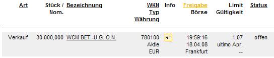 WCM prallt ständig an der Euro 0,06 ab. Gestern im ASK 240.000 Stück gekauft und soeben eine Stopp loss bei Euro 0,061 durchgezogen.