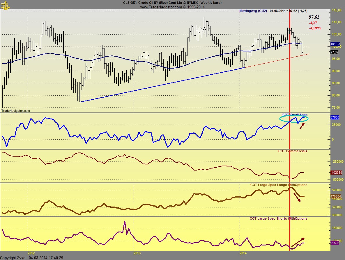 Ich habe die small Specs bei deren OI-Tiefs markiert und immer da war auch ein Preis Tief, gleichzeitig sieht man bei einem starken OI der Commercials anschließend eine Preiserholung.
