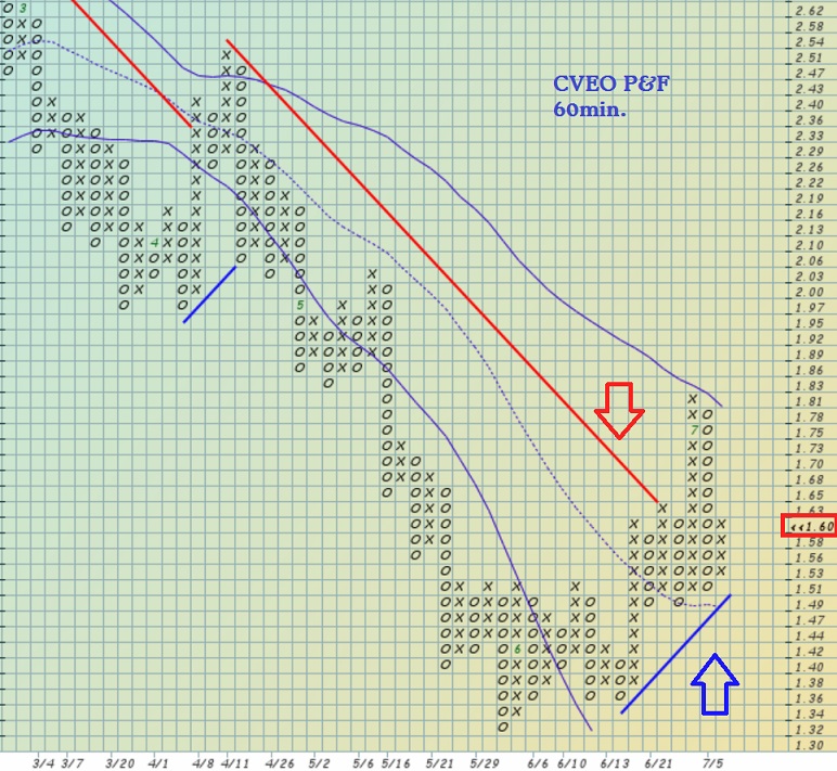 was ich erhoffe :D in point&figure, CVEO ist eingepresst zwiscxhen Unterstützung und Widerstand, mit der tendenz den Widerstand zu durchbrechen. Das Szenario hat noch Bestand, daher halte ich weiter...