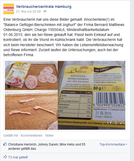 Die VZHH hat mich in ihre an verschiedene Stellen geschickte Emails einkopiert, von der Lebensmittelüberwachung Hamburg-Nord wurde ich bereits kontaktiert. Rewe wurde aufgefordert, schnellstmöglich mitzuteilen "welches Ergebnis die Ermittlungen ergeben haben und welche Maßnahmen ergriffen wurden, um zukünftig solche Verunreinigung zu vermeiden."