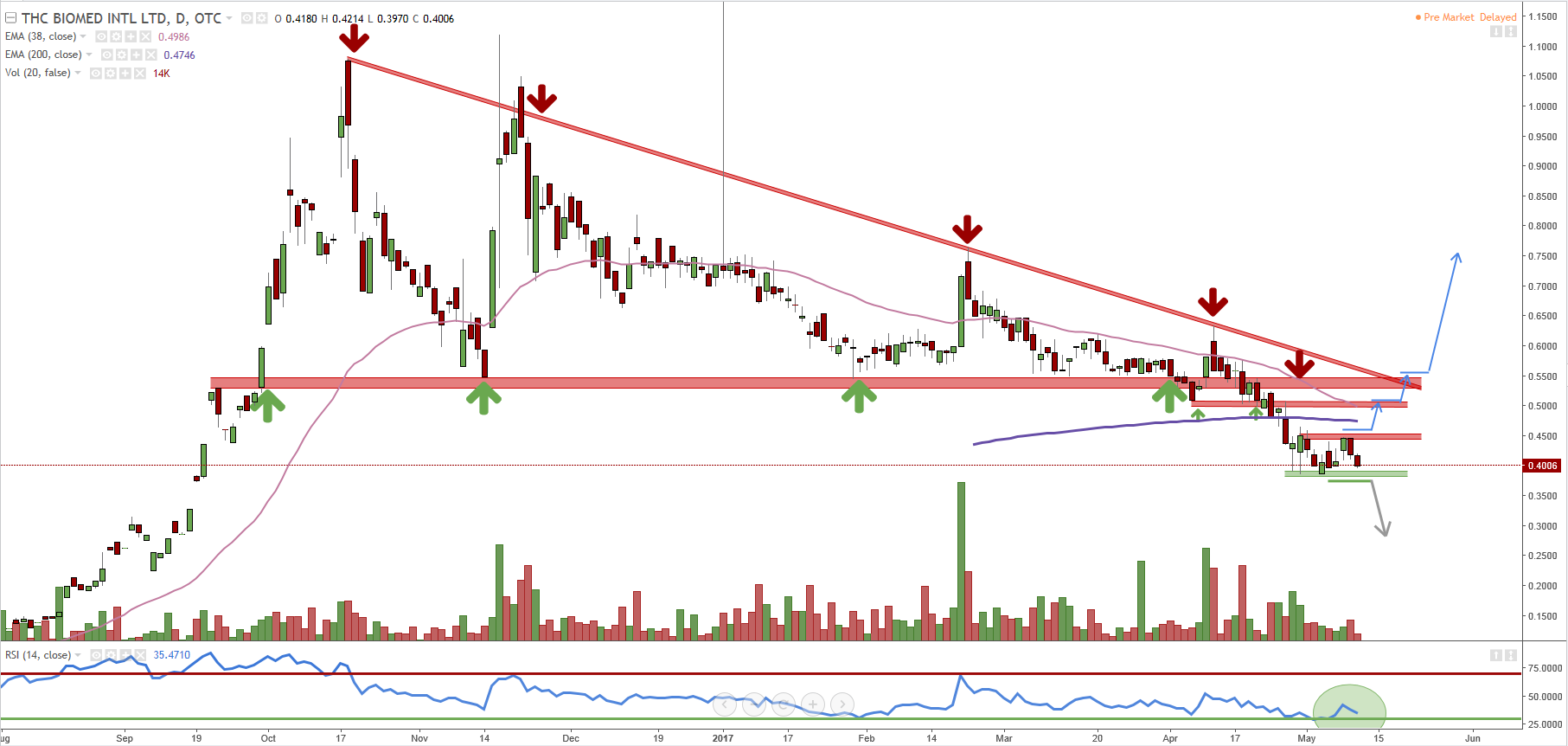Update 10.05.2017: Das Zittern geht in die nächste Runde - jedoch eine weitere Etage tiefer. Der Kurs ist seit dem Bruch der EMA 200 gefangen in der engen Range 0,38-0,45. Ein Unterschreiten der Range generiert das nächste technische Verkaufssignal - auf der Oberseite deckeln diverse Widerstände. Kurse über 0,55CAD kämen einem Befreiungsschlag gleich.