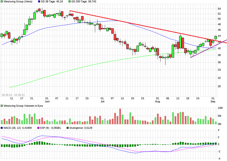 Wenn man es positiv sehen möchte könnte es charttechnisch ein aufsteigendes Dreieck werden mit der Obergrenze bei 44,5 Euro.