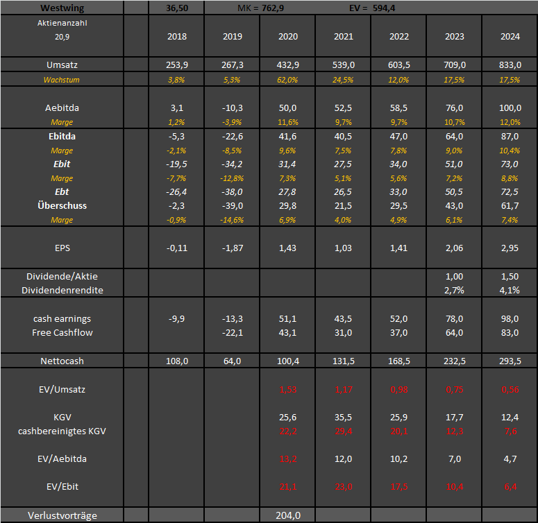 Ist mir nicht ganz klar, da Westwing ja noch 204 Mio Verlustvorträge Ende 2020 hatte. Das sollte noch 4-5 Jahre reichen, um zumindest in Teilbereichen nur die Mindeststeuer zu zahlen. Ich habe jedenfalls 2023/24 mit jeweils 15% Steuerquote kalkuliert.