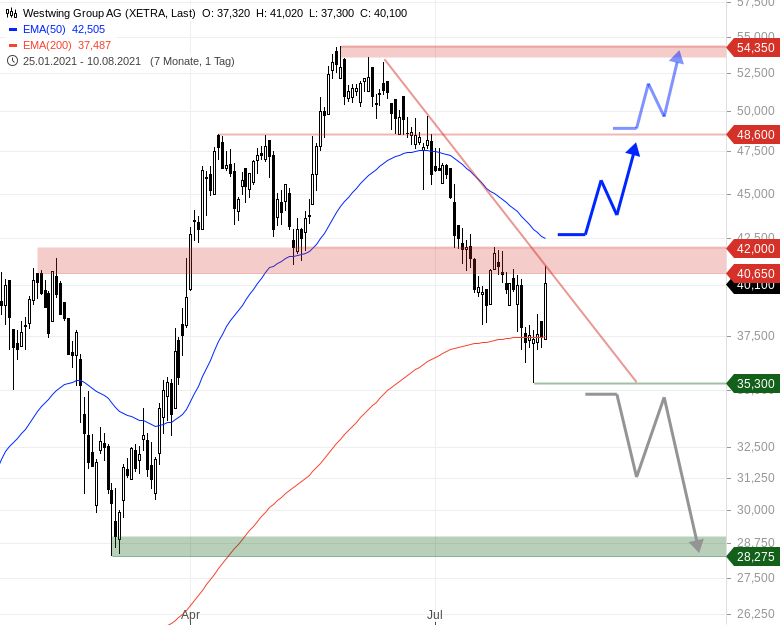 Werden diese Voraussetzungen erfüllt, gilt der EMA200 als nachhaltig verteidigt und es winken Kursgewinne bis 48,60 EUR sowie zum ATH bei 54,35 EUR.