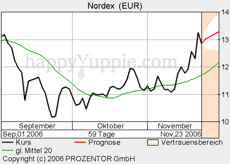 Für 2007 strebt der Windkraftanlagen-Bauer ein operatives Wachstum von rund 50 Prozent und eine weitere Verbesserung der Rentabilität an. Im Dezember will Nordex seine Prognose für das kommende Jahr präzisieren. An der Börse gaben die im TecDAX notierten Aktien von Nordex im frühen Handel entgegen dem Indextrend nach. Zuletzt fiel der Aktienkurs um 2,79 Prozent auf 12,91 Euro und war damit Schlusslicht im TecDAX. In den vergangenen Tagen hatte sich der Titel allerdings deutlich verteuert. Ein Händler stufte die Bilanz für die ersten neun Monate 2006 als "in Ordnung" ein.