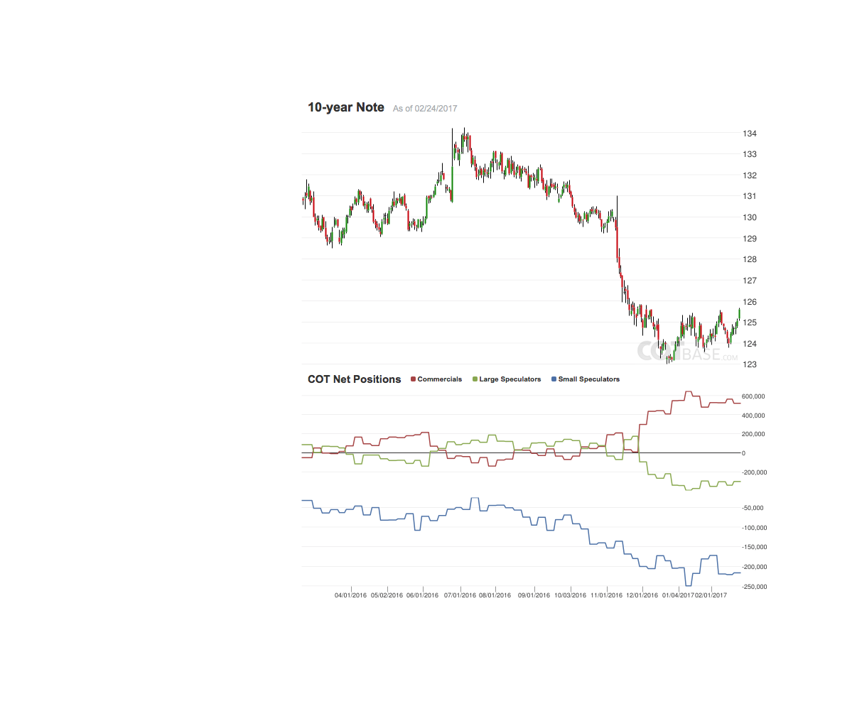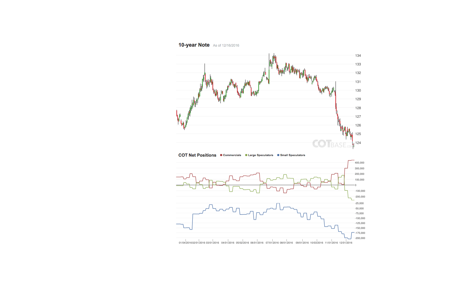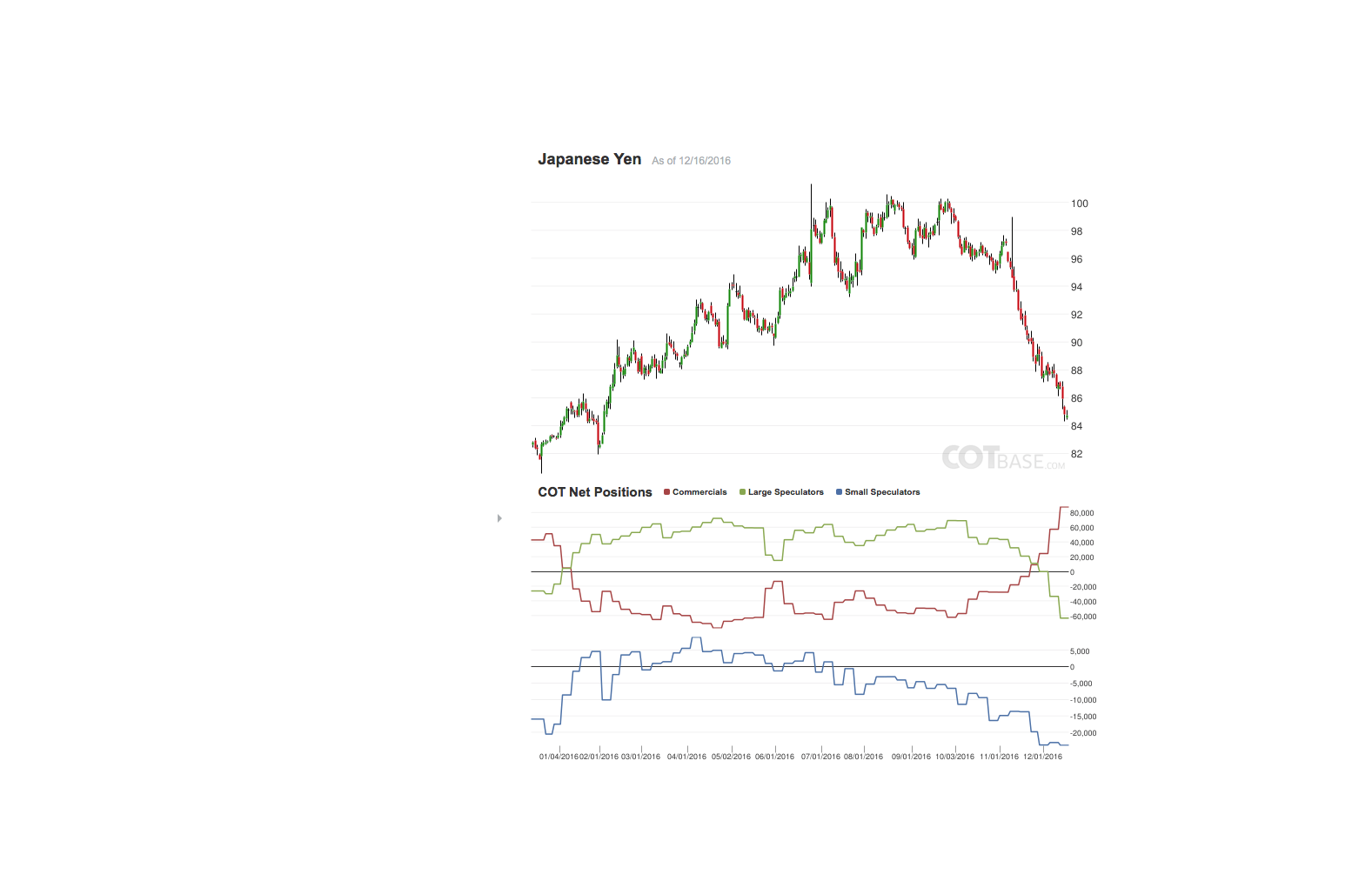die Cot-Daten für den Yen. Die Position der Small Specs könnte eine Wende im kommenden Jahr andeuten. Die Positionen der Coms und Large Specs sind zwar typisch, aber die Coms sind seit fast einem Jahr erstmals wieder stark Long positioniert. Be prepaired!
