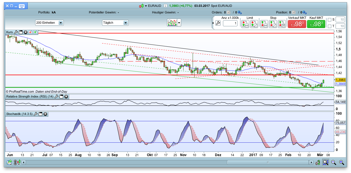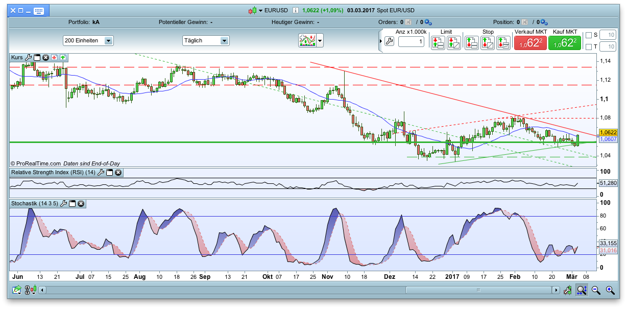 Das dürfte gegen die gefühlte Erwartung des größeren Teils der Marktteilnehmer stehen, dass der Euro schwach ist und gar bis zur Parität fällt. (Das Tief vom Jahresanfang wurde bisher trotz Unkenrufen nicht unterschritten)