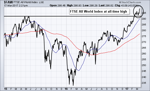 'Chart 1 shows the FTSE All-World Stock Index ($FAW) trading at a new record high. The FAW includes stocks from 47 developed and emerging markets. It just recently cleared its 2015 high which resumed its major uptrend. That's a positive sign because it shows that the stock market rally is global in scope.'