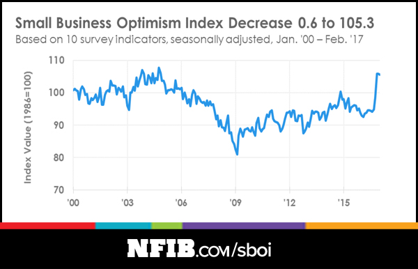 “It is clear from our data that optimism skyrocketed after the election because small business owners anticipated a change in policy,” said NFIB President and CEO Juanita Duggan. “The sustainability of this surge and whether it will lead to actual economic growth depends on Washington’s ability to deliver on the agenda that small business voted for in November. If the health care and tax policy discussions continue without action, optimism will fade.”