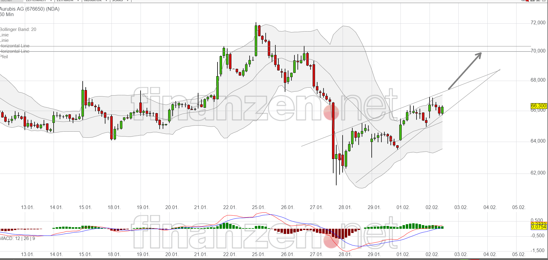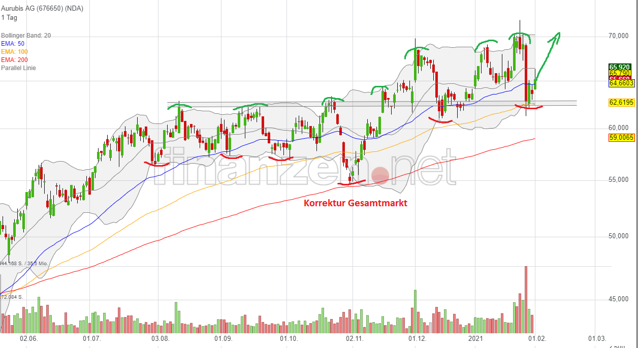 Charttechnisch lässt sich Aurubis gut mit dem Bollinger Band traden wie die Vergangenheit gezeigt hat. Nur eine Korrektur des Gesamtmarktes (-10%) würde uns wohl an EMA200 zurückbringen. Ich gehe davon aus, dass die 70€ am Freitag erreicht werden. Mit Veröffentlichung des Ausblicks kann dann alles neu bewertet werden :)