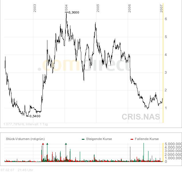 Es dürfte ratsam sein, sich von solchen Bewegungen nicht verleiten zu lassen. Denn im Jahr 2004 gab es eine ähnliche Entwicklung. Nach massiven Kursgewinnen auf bis zu 17,5 Dollar im August des Jahres 2004 ging die Aktie in einem stetigen Abwärtstrend über und fiel bis auf 86 Cents im August des laufenden Jahres.