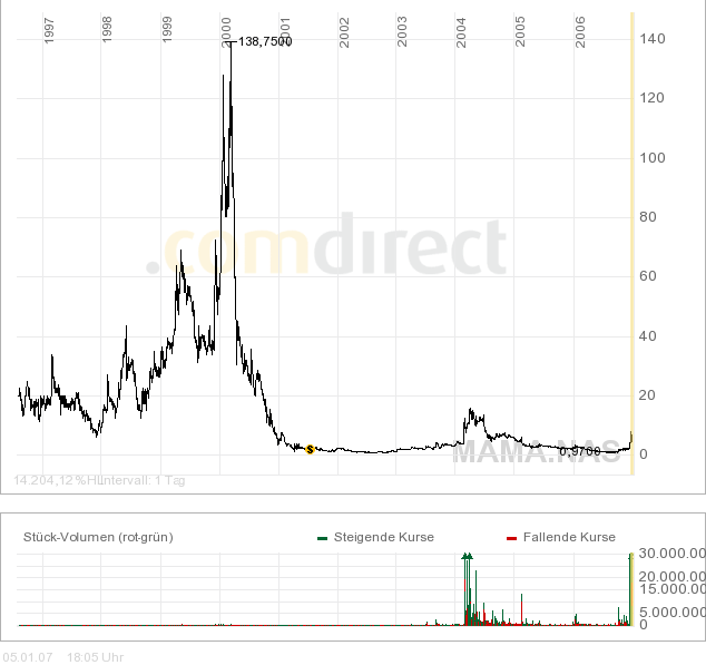 am 18.12.2006 2000 Stück für 5.25 USD gekauft, heute, 48 Stunden später für 6.35 wieder verkauft. Nettes Weihnachtsgeschenk. Werde, wenn unter 6.00 USD wieder nachkaufen. Schätze aber dass es sich hier um einen Hochrisikotitel handelt und nur wenn es bei Verlusten nicht allzusehr schmerzt, kaufen.