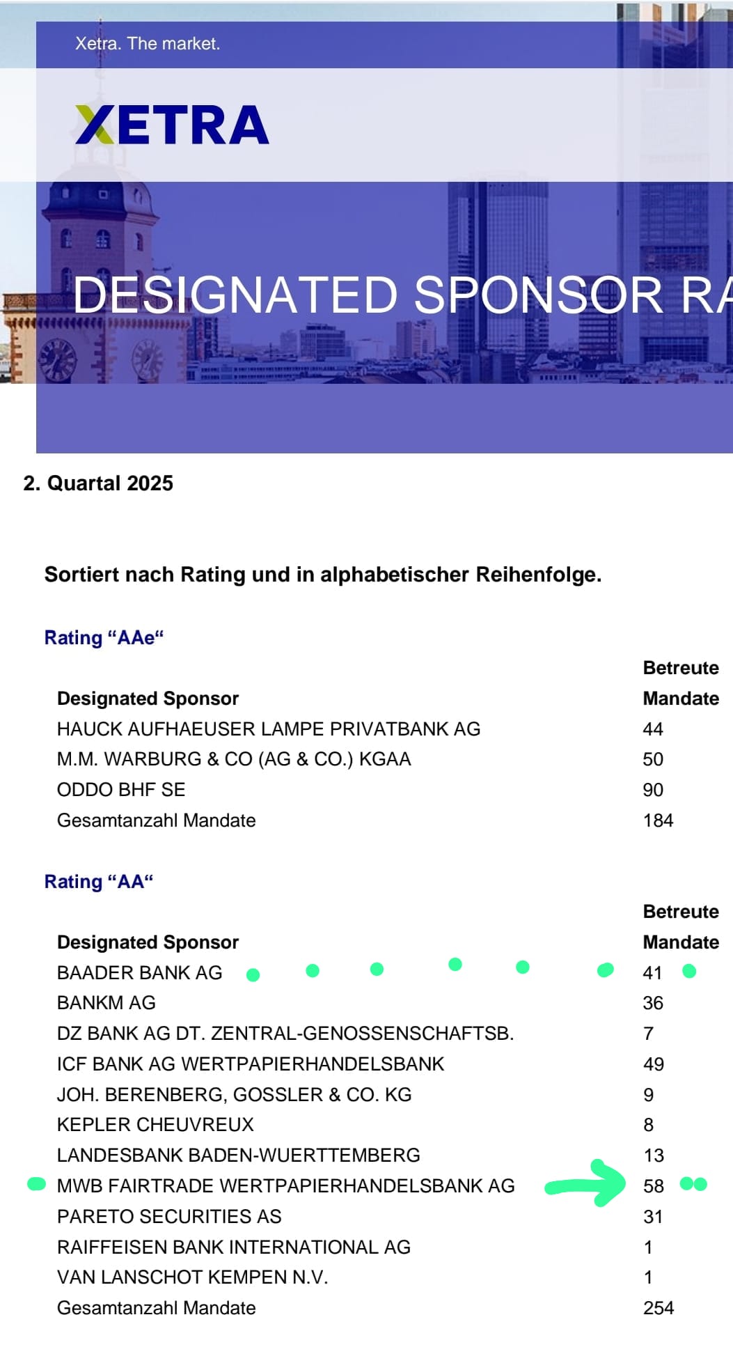 Kann es sein, dass MWB Fairtrade mit 58 Mandaten Spitzenreiter als Designated Sponsor ist? Noch vor der Baader Bank?