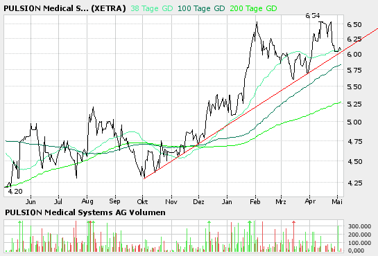 Ist natürlich - wie immer - relativ. Für Pulsion spricht einzig und alleine die Wachstumsdynamik, die aber noch immer intakt zu sein scheint. Die Bewertung ist nämlich verhältnismässig hoch, was mir im Grunde nicht schmeckt. Aber solange die Dynamik anhält, sollten wir auch eine parallele Kusrentwicklung hinbekommen. Die Fantasie mit dem PiCCO-System und den entsprechenden Auszeichnungen dürfte ebenfalls ein Übriges zum weiterhin positiv verlaufenden Kurs beitragen.