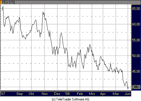Die Aktien der PEUGEOT SA haben ein bisher übles Börsenjahr 2008 hinter sich gebracht. Der Kurs kannte in den ersten fünf Monaten diesen Börsenjahres nur eine Richtung. Von Kursen über 60 € sind die Aktien fast ohnen nennenswerten Halt bis auf 40,00 € abverkauft worden. Diese Kurszone sollte aber einen Widerstand bilden und so weitere Kursverluste vorerst stoppen. Im Börsenjahr 2006 sind die Aktien schon einmal auf das Kursniveau gefallen und konnten sich im Anschluß signifikant erholen. Wir sehn bei einem Halten der Unterstützungszone um 40,0 € die hohe Wahrscheinlichkeit, dass der Aktienkurs drehen und wieder bis an die 50,00 € Marke laufen kann.