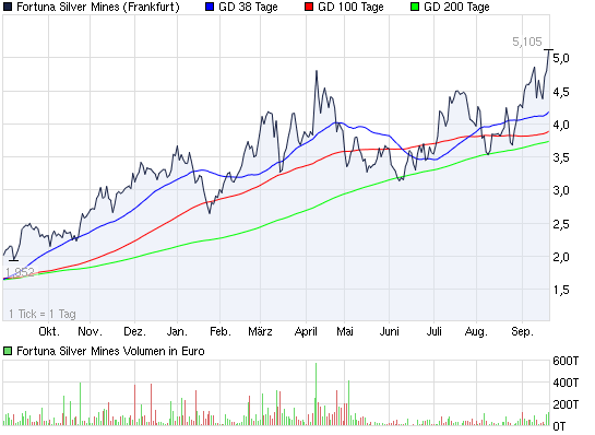 ... und kein Ende in Sicht! Der Kurs von Fortuna Silver Mines legt weiter zu (WKN A0ETVA). Derzeit liegt er bei 1,04 Euro und markiert ein neues Allzeithoch - wobei die Aktie ja erst seit kurzem gehandelt wird. Aber bei steigendem Volumen hat die Aktie noch Potential nach oben!