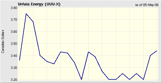 UrAsia is also developing the South Inkai property, located immediately south of Cameco’s Inkai joint venture project. UrAsia has a 70% stake in this project which is expected to start up in late 2007 with initial production coming in at 5 million pounds per year. (UrAsia’s 70% share would be 3.5 million.) All-in production costs are projected to be US$12.50 per pound. I expect the price of uranium to be over US$40 per pound by then, making the new mine very profitable. The company believes the production could be eventually doubled at South Inkai. All this will be done with no equity dilution – they can get debt for this entire capital cost.