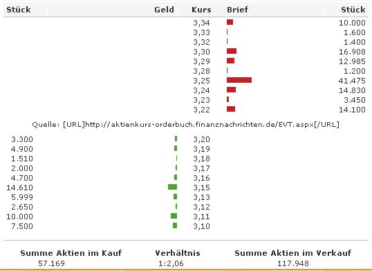 am 08.0806 lagen bei 3.20 € über 80 000 Stück zum Verkauf . Der kurs lag zum Schluss bei 3,28€ (oder so ). Deutlich drüber also, die 80 000 gingen da nicht auf die schnelle über den Tisch.