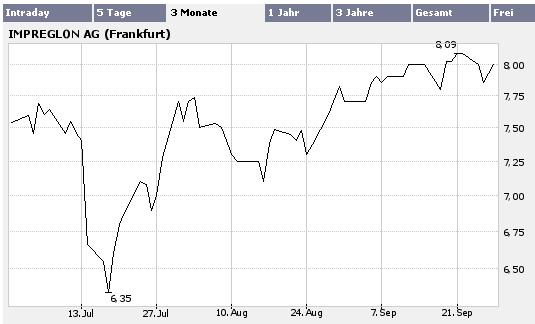 Als Impreglon Ende Mai an die Börse kam, wird es manche lange Gesichter gegeben haben: Die Aktie wurde zu 6,50 Euro zugeteilt, rutschte am ersten Handelstag aber auf 5,70 Euro. Seitdem zeigt der Trend indes nach oben, vor wenigen Tagen erreichte der Aktienkurs ein neues Rekordhoch bei 8,84 Euro. Am Freitag vormittag kostete die Aktie 8,60 Euro (Isin DE000A0BLCV5).
