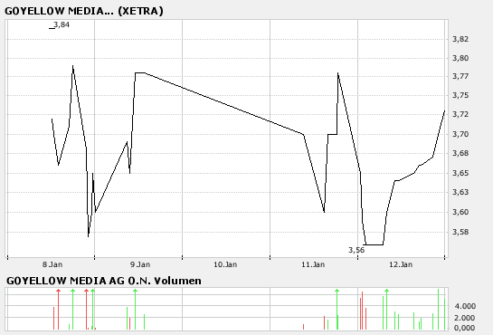 Wollte dann eigentlich unter 3 € nochmal rein, aber das wohl leider nichts. Ich bin weiterhin optimistisch bei GoYellow, sehe aber im Moment mein Geld anders besser investiert. Mal die nächsten Zahlen, oder News abwarten.