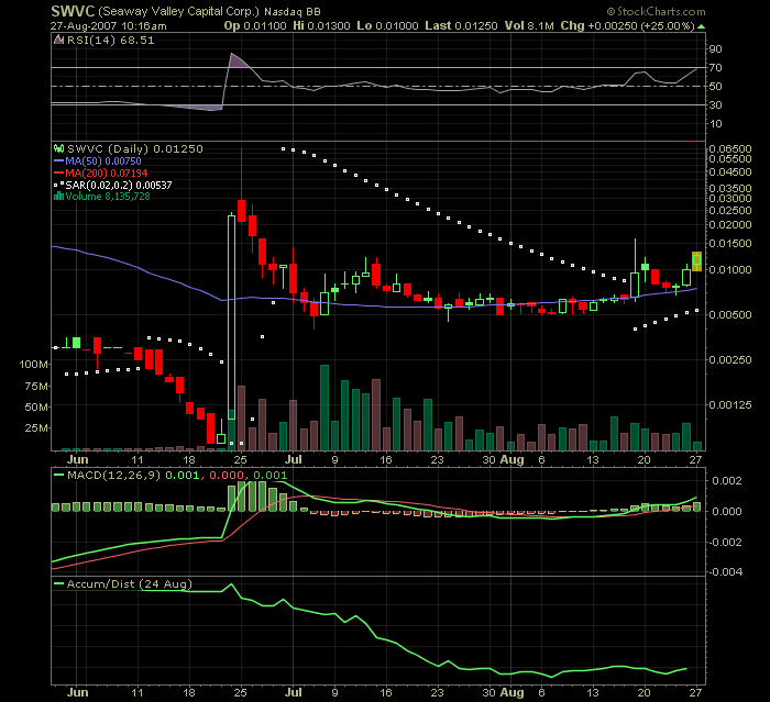 der Vergangenheit an. Kursziel 0,04$.Gestern in USA: SEAWAY VALLEY CAP CORP OTCBB 812815108 SWVC USD 0,0127 +15,45 % 30.08 | 21:59 und das bei dem Marktumfeld und ohne News.