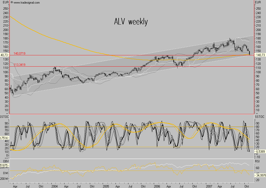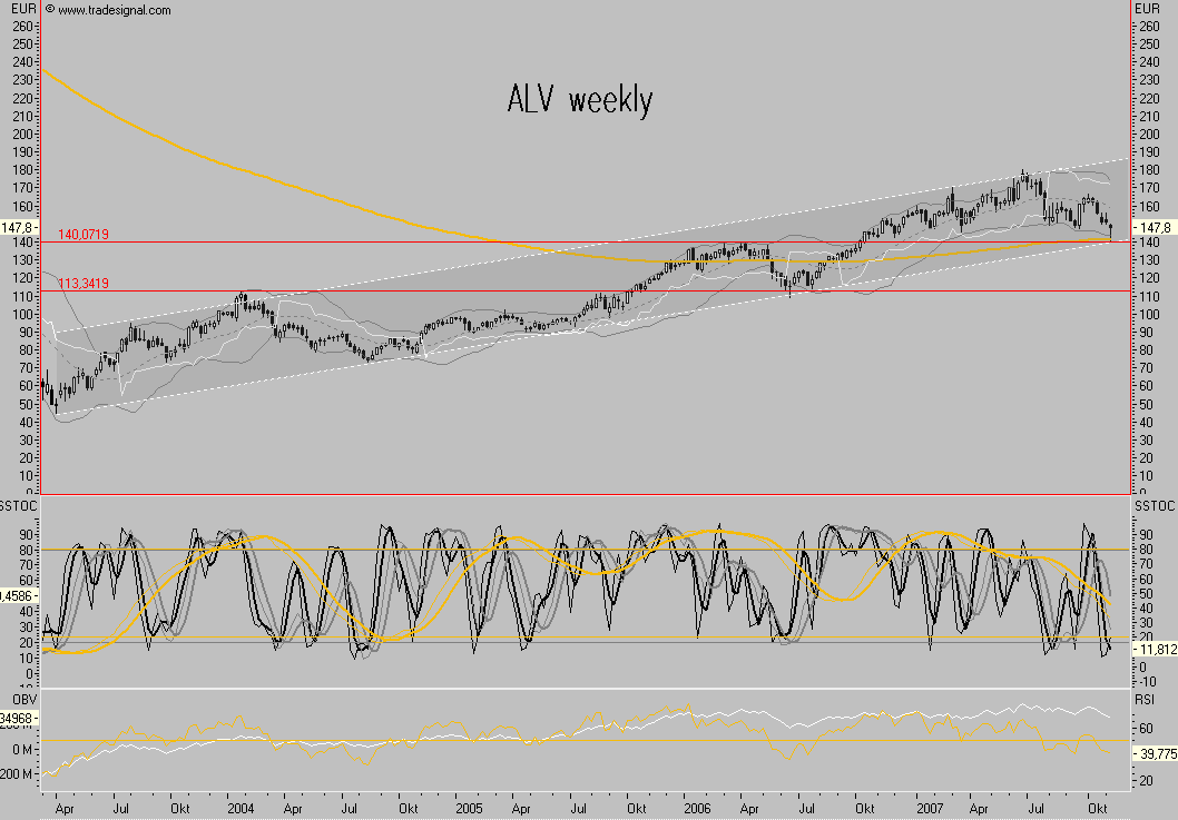 als primäres Ziel im Wochenblick lassen sich ca. € 140 ableiten, die Indikatorensicht würde das ebenfalls bestätigen, werden diese nachhaltig nach unten verlassen, liegen die Ziele wesentlich tiefer, weil dann von einer SKS-Formation ausgegangen werden muss, zu der ich derzeit nicht tendiere, zum gegebenen Zeitpunkt würde dies aber dann visualisiert, die vermeintliche Nackenlinie wäre bereits gebrochen.