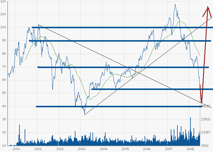 Fakt ist, das bei 54 € eine wesentliche Unterstützung liegt und wenn die nicht hält, gehts bis in den Bereich 43-45 €. Vorläufug nehm ich aber an, das die 54 hält und wir in den nächsten Wochen eine Gegenbewegung bis 62 € sehen können.