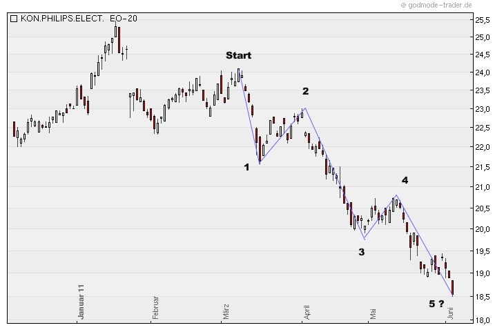 Rückblick: Seit einem Tief bei 10,84 Euro aus dem März 2009 legt die Aktie von Philips innerhalb eines Trendkanals zu. Dabei näherte sich die Aktie bereits dem Widerstand bei 19,31 Euro bereits deutlich an.