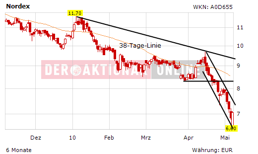DER AKTIONÄR hat die Nordex-Akt­ie spekulativ­ zum Kauf empfohlen.­ Anleger, die dieser Kaufempfeh­lung gefolgt sind, wurden am 28. April bei 7,50 Euro ausgestopp­t. Mit Neuengagem­ents sollte jetzt abgewartet­ werden bis die Sicht wieder klarer wird. Charttechn­isch befindet sich die Aktie in einem intakten Abwärtstr­end. Fällt die Aktie unter die Marke von sieben Euro, droht erneut eine Verkaufswe­lle.
