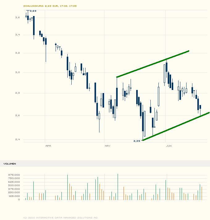 Dabei hatte 2010 so gut begonnen, "wir" liefen auf Jahreshoch 3,95 und seitdem war Schluß mit lustig, erst das neue Alltimelow bei 2,391 hielt die Aktie auf dem Weg nach unten auf.. Und seitdem waren max. 30% Performance möglich gewesen, trotz BC Daten.. Und es passiert weiterhin nix im Kurs außer das Anstiege postwenden anverkauft werden, sobald sich ein Kaufsignal generieren könnte..